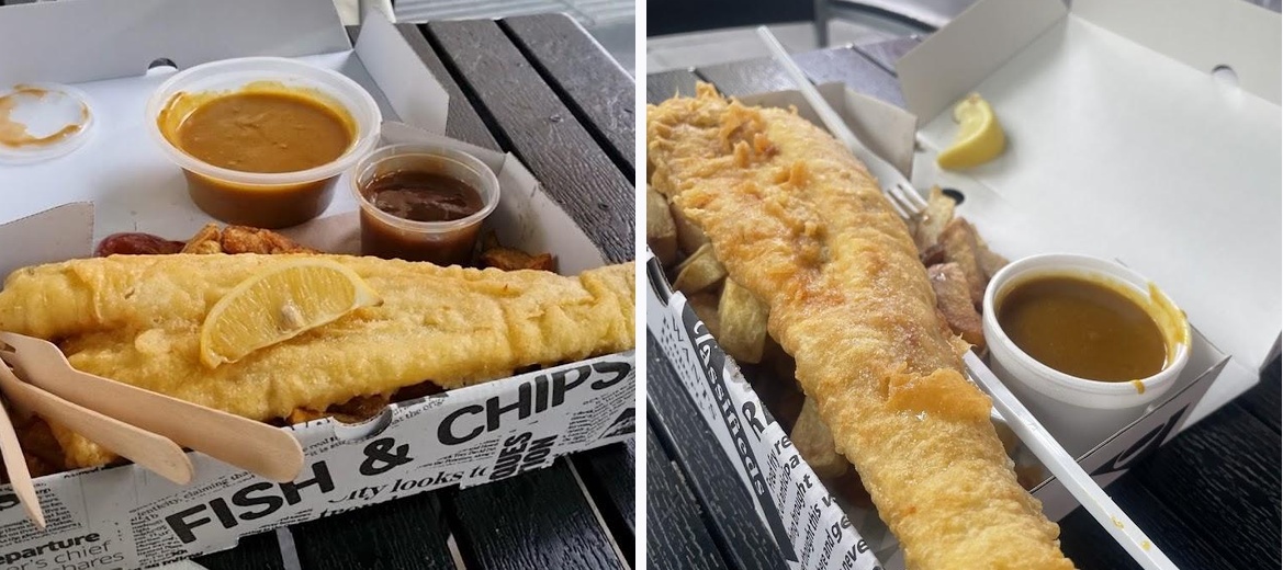The fish and chips feature fresh ingredients and various sauces, including unique curry sauce, enhancing the traditional experience.